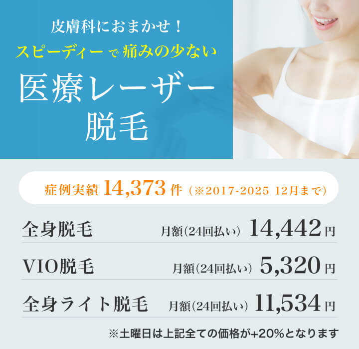当院は美容クリニックではなく、保険診療の皮膚科も行っているクリニックです。そのため万が一、皮膚トラブルが発生した場合でも医師がしっかり対応しますので、安心・安全に脱毛の施術を受けていただけます!