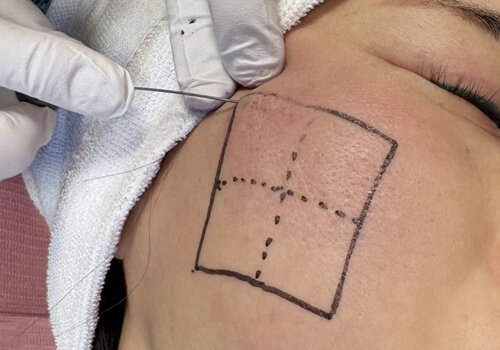 サブシジョンとは医療用の針を皮膚に挿入し、真皮内の線維組織を物理的に切断・剥離して癒着を解除して肌を内側から押し上げることで皮膚のへこみ(クレーター)を復元する施術です。 必要時は薬液を注入することにより、エラスチンやコラーゲンの生成促進を促します。 1回の効果は10〜50%の方が実感できると言われています。 治療回数は症状によりますが、回数を重ねるうちに効果が出てきます。 施術間隔は1〜1.5か月間隔で3回をおすすめします。